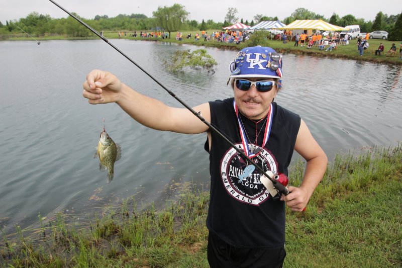 McVey thanked volunteers from Knight of Columbus Auxilio Council #16454 of St. Philip Parish in Posey County and Corpus Christi in Evansville, students from Reitz Memorial High School, members of the Civitan Club of Newburgh and others who turned out for a morning of fishing and fun. The Boonville Fire Department provided EMTs, and they moved around the lake visiting with anglers and their families.