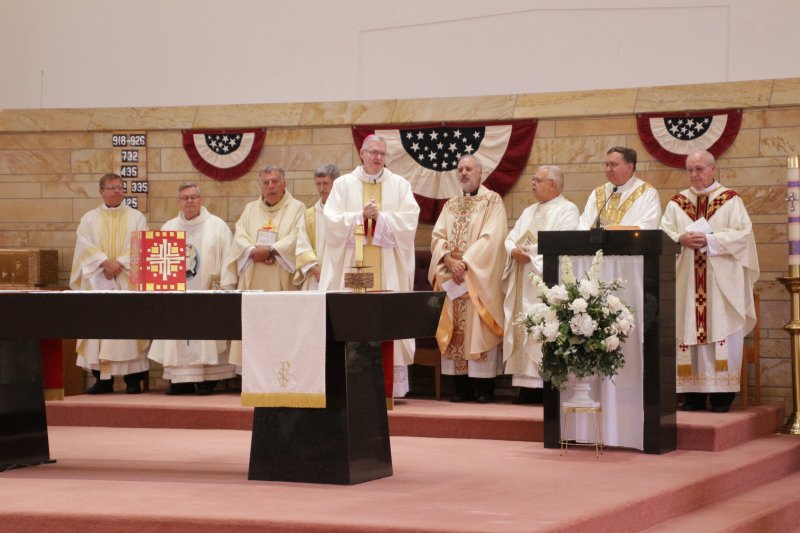 Father Ray Brenner, pastor of St. Joseph Parish in Jasper and dean of the diocese’s East Deanery, concelebrated with Bishop Siegel and Father John Brosmer, a native son of the parish and pastor of St. Boniface Parish in Evansville; Fathers Donald Ackerman and Tim Tenbarge, retired priests of the diocese; Father Eugene Schmitt, pastor of St. Isidore the Farmer Parish; and Father John Boeglin, pastor of Holy Family Parish in Jasper and Diocesan Director of Rural Life; and Father Ron Kreilein, pastor of St. Bernard Parish in Rockport and St. Martin I Parish in Chrisney. Deacon Mike Seibert assisted.