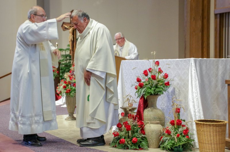 Bishop Francis R. Shea ordained Father Boeglin to the priesthood on Sept. 1, 1978, at St. James Parish in Haubstadt, Father Boeglin’s home parish. Many family members attended his Sept. 15 anniversary Mass, and they brought stalks of wheat from the family farm that were used in floral arrangements that graced Holy Family Church.