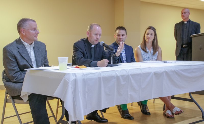 Following Mass and a buffet dinner, Diocesan Vicar General Father Bernie Etienne served as master of ceremonies for a fascinating panel discussion that explored “Humanae Vitae” through the eyes of a married couple with a large family; an M.D., who follows the teaching of the Church in his practice; and a priest who counsels married couples and those who are planning to marry.