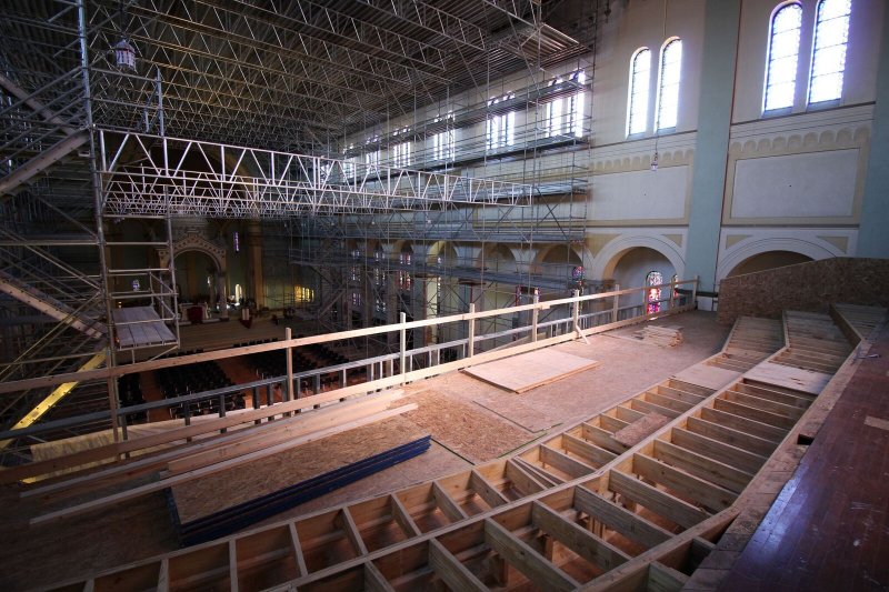 As you can see from the photos appearing with this story, the diocesan cathedral looks quite different from the way most have seen it. The removal of the pews and installation of massive scaffolding has cut seating capacity by more than 50 percent. “Our seating capacity has temporarily shrunk from over 900 to 410,” Father Mullen said. “Parishioners are good-spirited about this change, recognizing that the pews will return before the end of the construction. Especially at daily Mass, which occurs behind the altar, some have expressed their happiness at a more intimate setting for Mass. We are forced to be closer to one another in church and already several times, people have had to stand at Mass because of a lack of seating.”