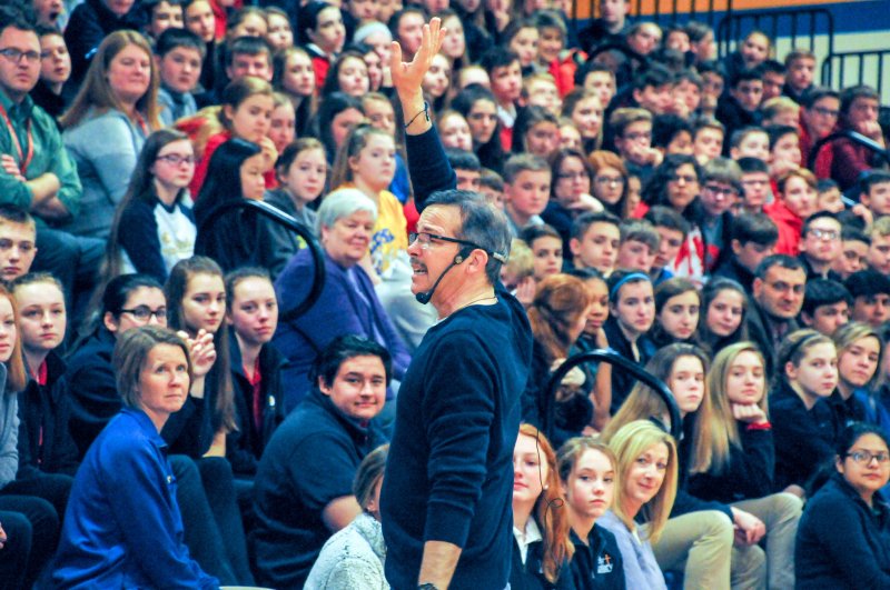 It’s not easy to keep the attention of about 600 students, but Patin didn’t seem to have a problem with it. During the roughly hour-long presentation, he used a series of games and ice breakers to keep kids engaged. Those included rock, paper, scissor; clapping when kids were too loud; and a heads or tails game.