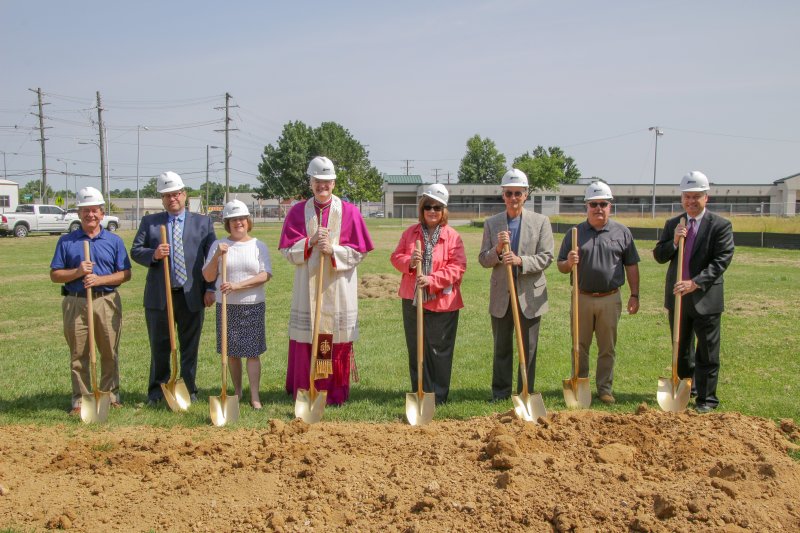 To help with the ceremonial groundbreaking, Vogel asked Bishop Siegel; Tim McGuire, diocesan chancellor and chief operating officer; Dan Ritter, Catholic Charities building committee chairperson; Burns; Dan Jones, Danco Construction, Inc. president; and Charline and Mike Buente of Buente-Buente Architects PC to join him as they turned dirt with golden shovels.