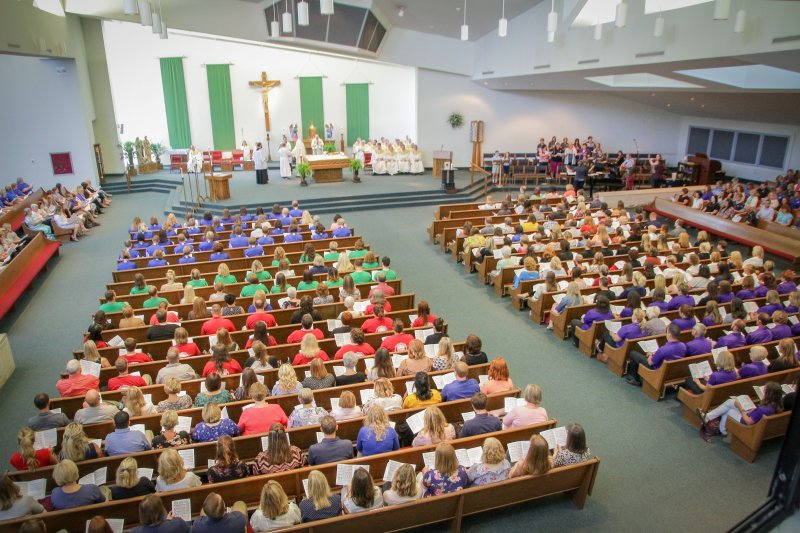 More than 500 Catholic educators from all 26 diocesan schools gathered at Good Shepherd Parish for the annual Back-to-School Mass on Aug. 2. Bishop Joseph M. Siegel celebrated Mass, 19 priests of the diocese concelebrated and Deacon Joe Siewers assisted.