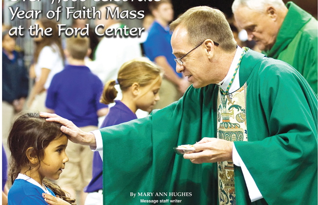 The issue includes a story about Susan and Steve Barron, natives of Evansville who lived through Hurricane Isaac, a pastoral letter from Bishop Thompson on the Year of Faith, and a story about the all-school Mass which was attended by 7,000 individuals.