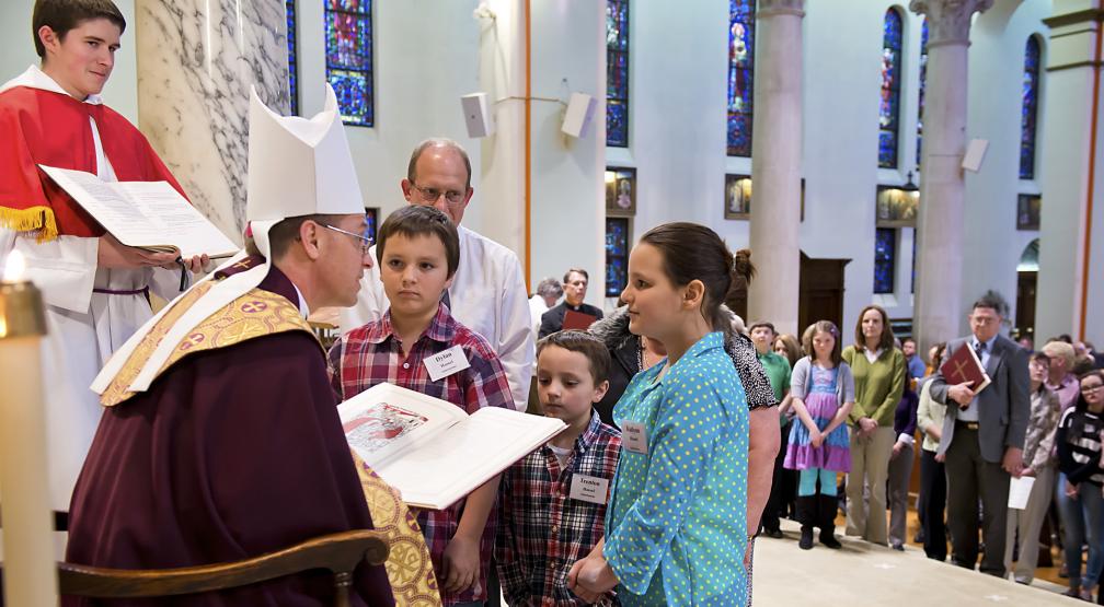 Bishop Charles C. Thompson celebrated the RCIA Rite of Election and Call to Continuing Conversion March 9 at St. Benedict Cathedral in Evansville. As he opened the ceremony, Bishop Thompson explained the significance of the event and of the Lenten season.