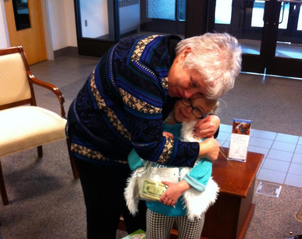 She recently attended all four weekend Masses there, and her brother explained the program to parishioners. After Mass she handed out $5 bills to 88 children — ages five through the teens — in both parishes. This spring, they will be invited to disclose what they did with the money.