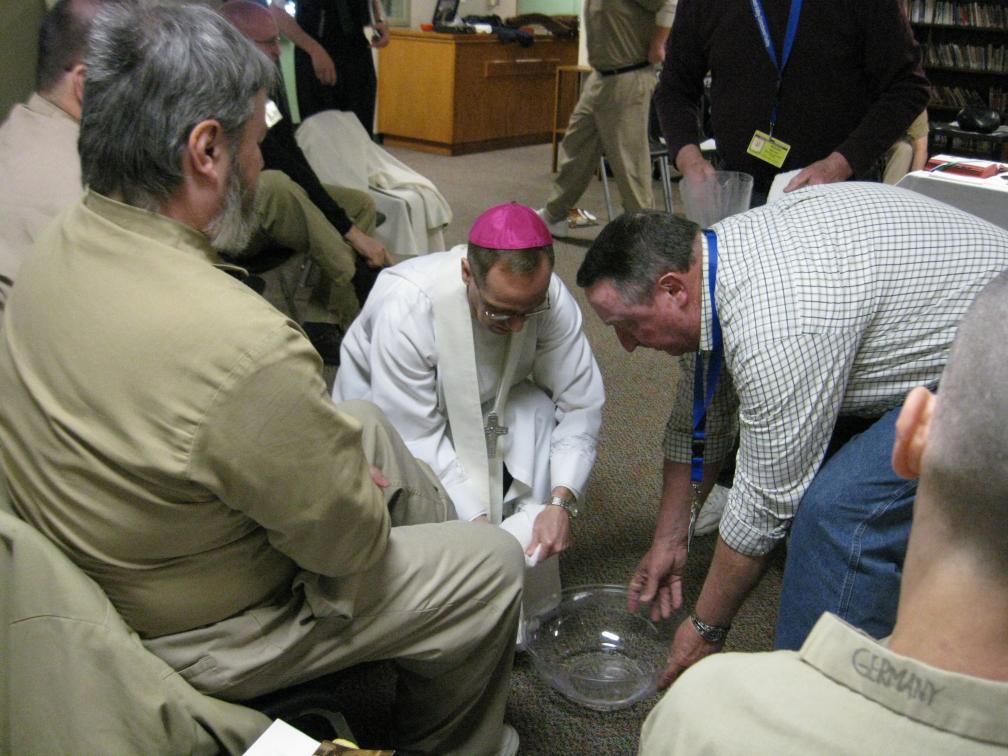 Ministry volunteer John Waylon assists as Bishop Charles C. Thompson washes the feet of an inmate at Wabash Valley Correction Facility, near Carlisle, Ind., during Holy Thursday Mass.