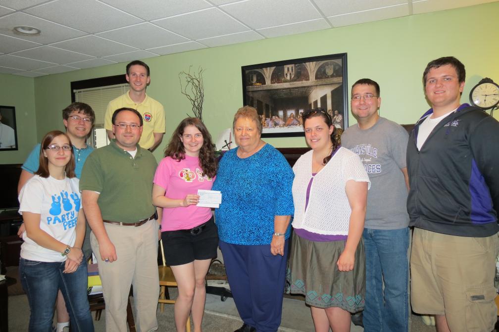 Marilyn Wassmer accepts a check from students at the University of Evansville to be used by her brother, Father Myron Effing, Mary Mother of God Mission Society in Vladivostok, Russia. “The money is from our annual Lenten collection,” said Michael Roesch, campus minister. The group includes Katie Ziebell, Nick Raupp, Roesch, Braden Maher, a seminarian from the Diocese of Springfield, Ill., Newman Club co-president Shelby Phelps, Wassmer, Alexis Niese, Jon Robson and Michael Novak.