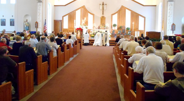 Father Dusty Burns, pastor of St. Philip Parish, Posey County, and Deacon Charlie Koressel lead a special celebration of Divine Mercy Sunday.