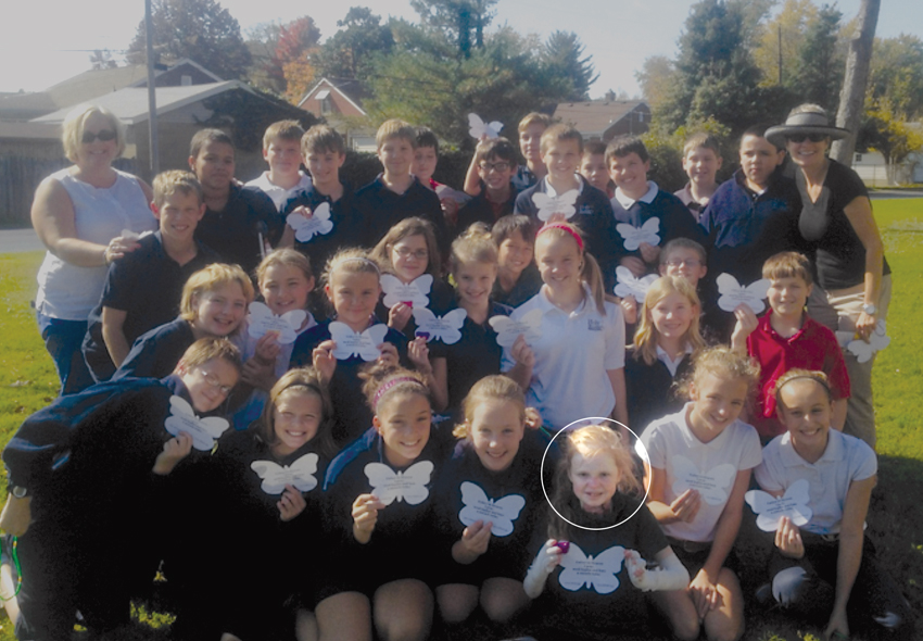 On a recent fall day, sixth graders at Holy Rosary School in Evansville took a walk and prayed the rosary together. Their prayers were in honor of their classmate, Sophie Schulz, who suffers from epidermolysis bullosa disease. Their walk together ended as they sang Sophie's favorite song, "She's a Butterfly."