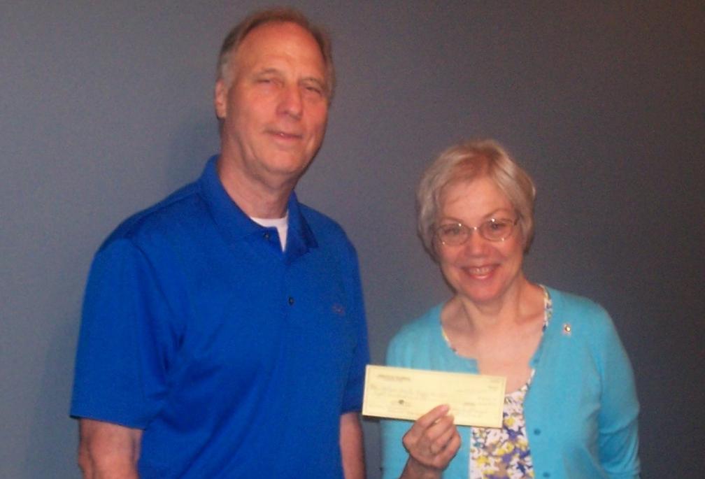 Ann Minnis, president of the Gibson County Right to Life, accepts a “One Rose – One Life” check from Bob Seib, grand knight of the Knights of Columbus Council 2215. K of C members collected donations at the doors of St. James and Sts. Peter and Paul parishes in Haubstadt, and at Holy Cross Parish in Fort Branch.