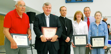 Above are the 2014 Mother Teresa Award winners and outgoing Catholic Charities Board members. Joining Bishop Charles C. Thompson, center, are award winner Robert Hildenbrand of St. Rupert, Red Brush, outgoing Catholic Charities board member Bill Jackson, award winners Zoe and Dick Cannon of Sacred Heart, Vincennes, and award winner Ellen Hegeman of Holy Spirit, Evansville. Outgoing Catholic Charities board members not shown include Kent Maurer and Shelley Ubelhor.