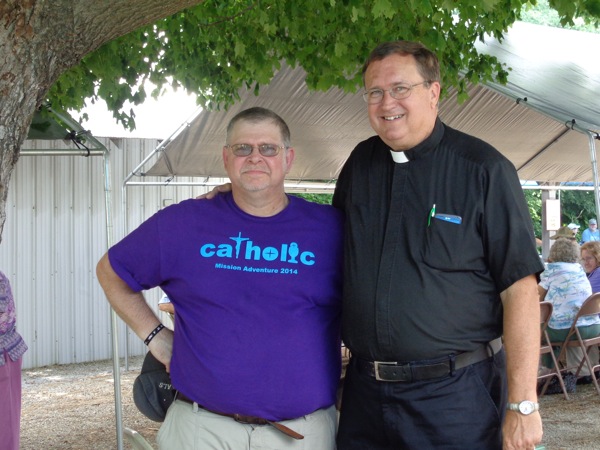 Deacon Mike Waninger, left, and new pastor Father Ron Kreilein joined a nice crowd that turned out for a day full of fun and good food. Father Ron becomes pastor of St. Martin, which includes St. Martin Church and St. John Chrysostom Church, on July 30. He also becomes pastor of St. Bernard Parish in Rockport on that date.