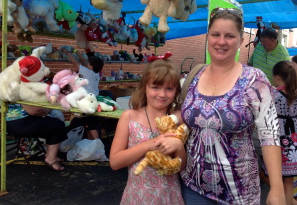 Claire Burgdorf hugs a prize she received July 20 during the St. Boniface Parish summer social. She is with her mother, Stephanie, at the social which was held on the Sacred Heart Church grounds. The new parish of St. Boniface was created July 1 by the merger of St. Agnes, Sacred Heart and St. Boniface parishes, all in Evansville.