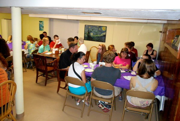 Father Jason Gries, pastor of St. John Daylight Parish and Holy Trinity Parish (seated at left of table in front) joined dozens of new and returning University of Evansville students for dinner during the UE Newman Center cookout and welcome celebration, which was Aug. 27.