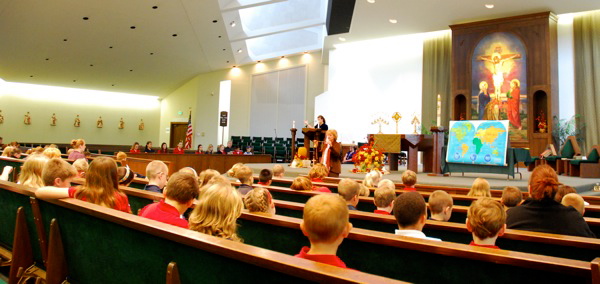In this photo, Holy Redeemer student Jessican Marquis, at the podium, leads the first Sorrowful Mystery. Fellow student Matthew Schroeder had just placed the continent of Africa, in green, on the world map. The other Sorrowful Mysteries were offered for the Americas, Europe, Oceana and Asia, respectively. St. John the Baptist School in Newburgh also participated in the Holy Hour.