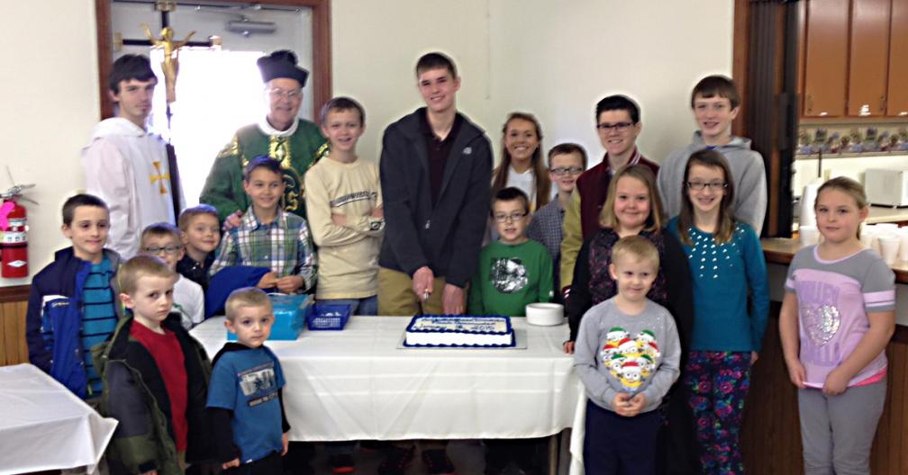 Donovan Cosgrove cuts the cake after making his first communion recently at Holy Name Parish in Bloomfield. He is surrounded by Pastor Father Joseph Erbacher and students in the Holy Name CCD program. Cosgrove will receive the Sacrament of Confirmation in April. He is the son of Kelli Cosgrove and Ken Flowers.