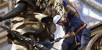 Until recently, they had to climb up the twisting columns, hoisting themselves with wooden pegs and ropes, using the decorative bronze leaves and branches wrapped around the columns as toe perches and handholds.