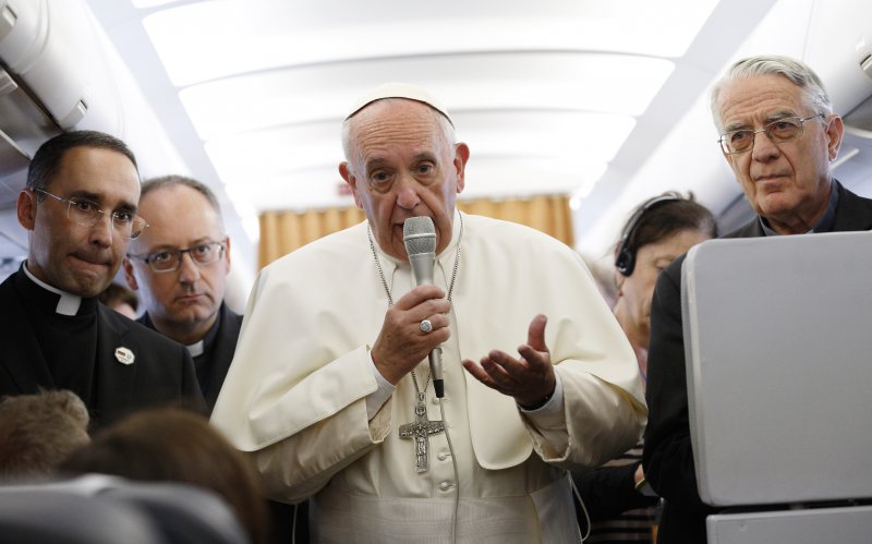 After his brief response to the questions, Pope Francis returned to his normal routine on outbound flights, walking the length of the plane and personally greeting each of the almost 70 media representatives. He collected letters and books and signed a few autographs.