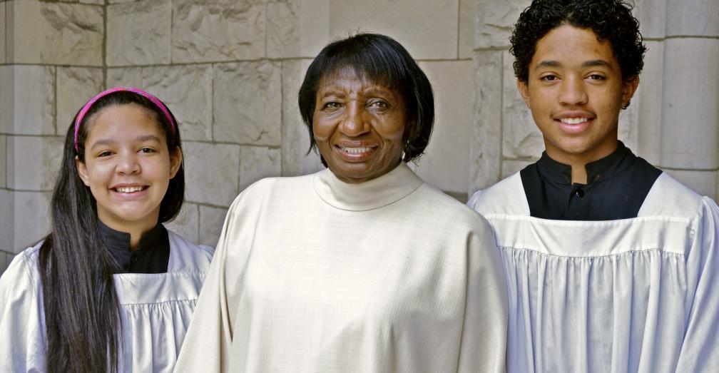 Betty Stallworth is pictured with grandchildren Emory and Robert Verstraete before a recent Mass at St. Augustine Church in Washington. Stallworth joined other parishioners from the church for the March on Washington in 1963. They started at the church, celebrated Mass and headed down to the Lincoln Memorial ca rrying parish banners.