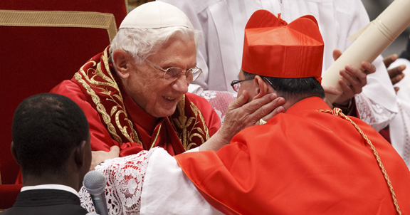 VATICAN CITY (CNS) -- Recalling that Christ's mission transcends "all ethnic, national and religious particularities," Pope Benedict XVI created six new cardinals from four different continents, representing the Latin rite of the Catholic Church as well as two Eastern Catholic Churches.